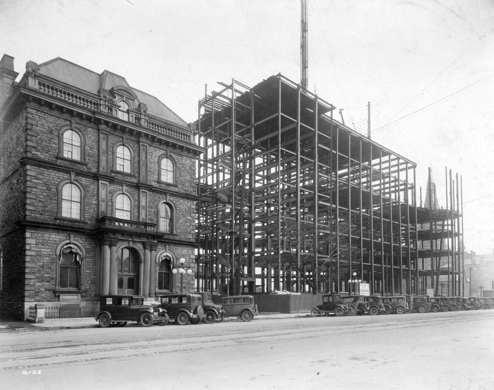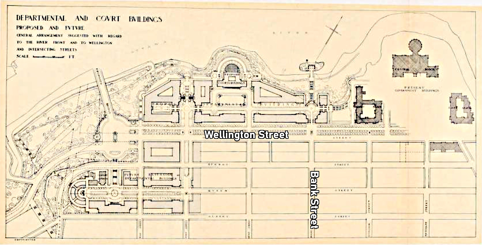 The government had grandiose plans for this area, such as the one in the Holt Plan in 1915 showing multiple government buildings along Wellington and Bay Streets. However, with the First World War raging and most likely due to the fact the Centre Block of the Parliament Buildings burned to the ground in 1916, the plans for this area were put on hold for well over a decade and many of the houses remained until 1938.